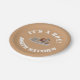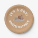 Niedlich gepolsterte Tiere Themed Paper Plate Design weist einen bräunlichen Hintergrund auf den Satz "It's a Boy!" in weißer Schrift. Auch in der weißen Schrift ist der Name des Babys. Das Design-Center zeigt ein Bild von niedlichen, kuscheligen Tieren, die alle zusammen gezaubert und bereit sind, das Baby zu empfangen!