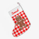 Dieser Weihnachtsfest-Strumpf bietet einen niedlichen Lebkuchenmann mit einem Hintergrund aus rotem und weißem Gingham. Oben ist ein Name für Sie zu personalisieren.