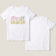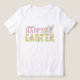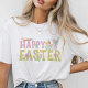 Personalisierte, trendige und niedliche handgeschriebene Typografie Happy Oaster T - Shirt mit handgemalten Hasen, Küken, Blume, dekorierten Eiern und Karotten in lebhaften Frühlingsfarben. Originelle Kunst von Leslie Larson.
