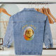 Bleibe diesen Ostern mit dieser saisonalen Denim-Jacke, die mit einem köstlichen Küken-Schraffen aus einem farbenfrohen Ei besticht. Der Gruß "Happy Oaster" ist über dem Bild, im Frühjahr gelb.