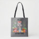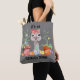 Dieser Totbeutel ist mit einem zauberhaften Strauß ausgestattet, der eine rot-weiße Schleife und Augenbrille hinter einer Reihe von bunten Pflanze und Früchten trägt. Der schwarze Text über und unter dem Bild sagt: "Es ist ein Straußengeschäft". Das Bild und der Text werden auf einem mittelgrauen Hintergrund auf beiden Seiten des Beutels platziert.