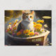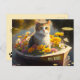 Postkarte mit einem Gemälde mit einem niedlichen Kätzchen, das mit guten Wünschen in einem Boot ankommt. Die Pfotendrucke auf der Rückseite sind optional.