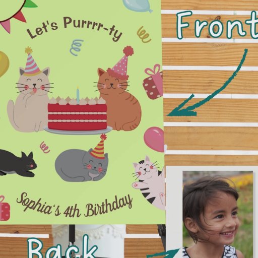 Mit der Niedlichen Kitty Cats Blue Birthday Party Card machen Sie einen kleinen Tag ganz besonders! Auf dieser bezaubernden Karte befinden sich zwei Party-fertige Katzen in der Mitte: eine leckende Creme von der Pfote, die andere sitzt neben einem Geburtstagskuchen und trägt beide fröhliche Geburtstagshüte. Die Szene ist umgeben von lustigen Geburtstagselementen wie Serpentinen, verpackten Geschenken, Ballons und einem bunten Banner, alles Set vor einem blauen Hintergrund. Oben steht "Happy Birthday!", unten steht ein individualisierbarer Platz für den Namen des Kindes. Das Innere ist leer, sodass Sie Platz haben, um Ihre eigene süße Nachricht oder Ihren Geburtstagswunsch zu schreiben.