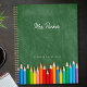 Ein moderner personalisierter Planer für Lehrer mit grünem Chalkboard-Hintergrund mit farbenfrohen Stiften. Name des Lehrers in Skript. Benutzerdefinierter Text ganz unten in einem Serif-Schriftart.