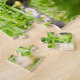Eine niedliche Babykatze, die spielerisch auf einer grünen Wiese sitzt, in einem Garten, der die verlassen Pfote aufhält, eine echte Katzenwelse an einem sonnigen Frühlingstag. Ein lustiges Foto von Katho Menden. Dieses Rätsel ist eine Geschenkidee für Katzenliebhaber.
