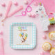 Niedlichen alberne Goose Junge's 1. Geburtstag Papier Teller mit einem niedlichen Aquarell Babygans mit einem Party Hut und Ballons auf einem weichen pastellblauen karierten Hintergrund.