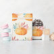 Umhüllungspapier illustriert mit einem sich wiederholenden Muster einer Aquarellbild eines orangefarbenen Kürbis, der mit farbenfrohen Herbstlauben und Krawatten dekoriert ist.