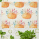 Ein Küchentuch, illustriert mit einem sich wiederholenden Muster einer Aquarellbilderin eines orangefarbenen Kürbis, der mit farbenfrohen Herbstlauben und Krawatten geschmückt ist.