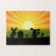 Sonnige Osterdarstellung mit 2 niedlichen Cartoon-Kaninchen, die ein Ostereier auf einem natürlichen Hintergrund malen.