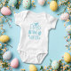 Dieser Babybodyanzug zeigt das blaue Textbild "Erstmaliger Jäger" mit Ostereiern. Ideal für das erste Ostern Ihres Babys.
