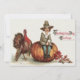 Dieser Pilger hat einen entspannenden Erntedank. Dieser Vintage Erntedank zeigt einen niedlichen kleinen Pilgerjungen, der auf einem Kürbis sitzt, einen Truthahn an seiner Seite. Der Junge hält einen Zweig von Herbstlauben.