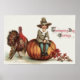 Dieser Pilger hat einen entspannenden Erntedank. Dieser Vintage Erntedank zeigt einen niedlichen kleinen Pilgerjungen, der auf einem Kürbis sitzt, einen Truthahn an seiner Seite. Der Junge hält einen Zweig von Herbstlauben.