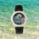 Stilvolle Uhr mit weißen Ziffern, die das Foto eines Paares niedlicher Sea Otters zeigt, der mit einem Kugelspielzeug spielt. Wählen Sie Ihre Uhr aus verschiedenen Stilen.