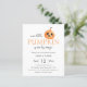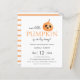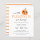 Einfache und moderne Halloween-Babydusche mit einem niedlichen Kürbis auf weißem Hintergrund. Mit den Worten "unser kleiner Kürbis ist auf dem Weg " und Streifen pastellfarben orange und weiß Rückseite. Bereit für einfache Personalisierung.
