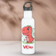 Diese personalisierte Wasserflasche für Kinder ist mit einem süßen, roten Dinosaurier mit großen Augen und einem freundlichen Lächeln ausgestattet. stehend und freundlich, umgeben von Blume und Schmetterlingen.