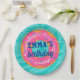Diese inspirierte Geburtstagsparty-Platte mit hellblauem Wasser aus dem Pool, einer süß rosa Donut Innenröhre und lustiger Typografie. Dieses Design ist eine lustige Wahl für Kinder Pool Party!