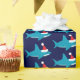 Papier mit niedlichen, lächelnden, blauen Haie in Weihnachtsmannmützen auf blauem Hintergrund wackeln.