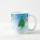 Niedlicher Schneemann mit Schneeflocken und geschmücktem Weihnachtsbaum ist so festlich für die Ferien.