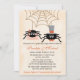 Dieses liebenswerte Paar ist süßer als spoky! Die Braut trägt einen blass pfirsichen und korallenförmigen Schleier mit einem Blumenhaarclip, auf dem ein Imitat-Diamant-Look mit solitaire Kristall bedruckt ist (Bitte beachten Sie, dass keine dreidimensionalen Verzierungen in das Kunstwerk auf dieser Einladung aufgenommen wurden). Der Dapper-Bräutigam trägt einen grauen und orangefarbenen Oberhut und eine Bugs-Krawatte. Das niedliche Paar hängt von einem goldenen Spinnennetz auf einem antiken und Vintagen Pergament-Hintergrund. Die Rückseite der Einladung hat ein orangefarbenes und weißes Polka Punkt Herzmuster Design. Dieses Design ist ideal für einen Herbst Halloween themed Paare Polterabend oder Brautparty. Kunstwerk © Chrissy H. Studios, LLC. Alle Rechte vorbehalten.