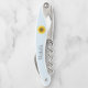 Niedlicher Korkenzieher mit gelbem Sonnenblumenbild. Set auf einem blauen Hintergrund, können Sie schwarzes Skript mit Ihren eigenen Informationen anpassen. Ideal, um Ihren Getränkedosenzubehör einen persönlichen Stil hinzuzufügen.