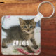 Personalisierter Schlüsselanhänger mit einem lustigen Foto einer Tabby-Katze. Das Haar auf dem Rücken leicht erhöht und er hat einen überraschenden Gesichtsausdruck. Niedlich und bezaubernd. Lächelt dich. :