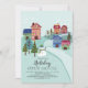 Niedliches Village Holiday Open House Einladung mit kleinen Hütten, Weihnachtsbäumen und einem Schneemann.