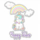 Ein Vinyl-Aufkleber mit einer weißen Einhorn-Illustration. Sitzen mit geschlossenen Augen und ein wenig rotes Herz in der Mitte ihrer Brust. Ihr extravaganter Mann und Schwanz ist locker und niedlich in Pastellfarben. Ein Regenbogen oben mit Wolken. Herzlichen Glückwunsch Vibes, geschrieben unten.