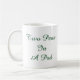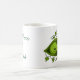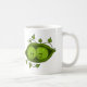 Niedliche skurrile Abbildung von zwei Erbsen aus grünem Cartoon mit lächelnden Gesichtern in einer grünen Hülle. Über und unter der Hülle befinden sich Reben mit grünen Blätter. Auf der anderen Seite der Tasse im grünen Text stehen die Worte "Zwei Erbsen in einem Pod"
