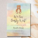 Die Einladung zur Babydusche ist mit einem niedlichen handbemalten Teddybär und einem wasserfarbenen Regenbogen dekoriert. Im braunen Text steht: "Wir können frühzeitig warten!" Diese Einladung eignet sich hervorragend für eine geschlechtsneutrale Babydusche. Original Wasserfarbe © Michele Davies.