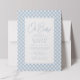 Ein klassisch blauer Gingham rahmt diese süße und einfache Baby Dusche ein. Mit individuellem Text ist diese Gingham Baby Dusche Einladung ideal, um unterwegs einen kleinen Jungen zu feiern. Der Rücken ist ein Blau mit weißen Punkten. Matches Baby Dusche Party auch in der Kollektion von Lea Delaveris Design!