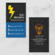 Auf der Rückseite, in einem weißen Deckel, oben ist ein gelbes Glühbirnen-Logo des Elektrikers, gefolgt von Ihrem prestigeträchtigen Namen, Kontaktdaten und Slogan-Slogan-Slogan-Slogan-Slogan-Slogan-Slogan, um Ihre Dienste zu werben.