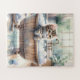 Eine hübsche Aquarellillustrierung eines köstlichen Kätzchens, das in einer rustikalen Holzwanne ein Schaumbad genießt, mit einer ruhigen Kulisse aus Pflanze und sanftem natürlichem Licht, das durch ein Fenster gefiltert wird.