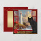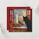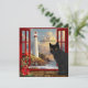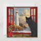 Eine niedliche schwarze Katze Weihnachtskarte. Diese Karte basiert auf einer Reihe von Gemälden mit dem Thema "Zimmer mit Aussicht". Vom Fenster aus hat man einen Blick auf eine felsige Küste mit einem Leuchtturm. Ein Leuchtturm als Leuchtturm der Hoffnung und ein Versprechen für ein besseres neues Jahr! Auf der Rückseite ist ein bordeauxroter Hintergrund mit einem vergoldeten Zentrum, mit dem Sie auch Text hinzufügen können. (in diesem Fall können Sie die matte Papierauswahl wählen).