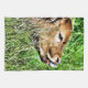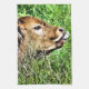 Ein schönes niedliches Kalb, das im langen Gras liegt und seine Zunge herausklebt.