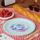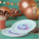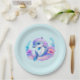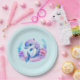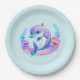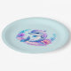 Papier Teller mit einer schönen Abbildung. Ein blauer und lila Delphin, umgeben von hübschen bunten Pflanze.