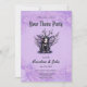 Niedliche dunkle Fee mit Flechtwings. Eine niedliche, stylisierte, dunkle Fee mit großen, ausdrucksstarken Augen und spitzen Ohren. Sie hat schwarzes Haar und trägt ein dunkles lila Kleid mit Spitzenteilen. Bat-ähnliche Flügel in lila Farbtönen reichen von ihrem Rücken aus. Hinter ihr sind nackte, schwarze Zweige mit kleinen, runden Beeren. Der Hintergrund ist eine weiche Lavendelfarbe mit Blumenmustern, die eine skurrile und leicht gotische Atmosphäre schafft.