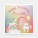 Diese individuellen Servietten aus Party haben ein magisches und bezauberndes Thema. Der Hintergrund ist ein Regenbogenverlauf. Zwei niedliche Einhörner werden oben mit kleinen Regenbögen, Wolken und der Sonne abgebildet. Ein Beispiel Happy Birthday Nachricht und Name werden in einem hübsch rosa Schriftart gedruckt. Sie können die Servietten so personalisieren, dass sie Ihren eigenen individuelle Name oder Text enthalten.