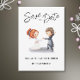Niedliche und einmalige Save the Date Hochzeitsankündigung mit einer Abbildung eines Mädchens und eines Tanzes. Illustriert und entworfen von Patricia Alvarez.