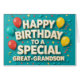Feiern Sie den großen Tag Ihres Urenkelns mit dieser bezaubernden Geburtstagskarte mit farbenfrohen Ballons, Konfetti, Raffael und einem fröhlichen aquamarinen Hintergrund. Das spielerische Design ist perfekt für Jungen jeden Alters - ob er nun 5 oder 25 wird. Im Inneren personalisieren Sie Ihre Nachricht, um eine herzliche Notiz von seinem "Lieblings" Großen Großeltern, eine lustige Erinnerung oder sogar ein Foto für eine benutzerdefinierte Karte, die er Liebe. Es ist eine lustige und festliche Art, ihm lassen, wie besonders er ist!