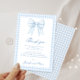 Elegante Babydusche bedankt sich bei einer Karte mit niedlichem, hellblauen Bugband, umgeben von Gingham-Mustern.