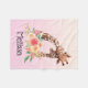 Eine Decke mit einer niedlichen zeichnend in Aquarellen einer Mama- und Babygiraffe. Die Muttergiraffe ruht sich auf der Giraffe des Babys, liebend und liebenswert. Hübscher rosa, gelber, grüner Aquarellbouquet unter diesem Lieblingspaar. Ein Farbverlauf, der mit einer weichen rosa Farbe erzeugt wird, die in eine hellpeachisch orangefarbene Farbe übergeht.