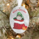 Ein zauberhaftes, weißes Bartgrab mit einer grünen und weißen Schneeflocke-Weihnachtsmannmütze Pop aus einem roten Geschenksack vor diesem Weihnachtsschmuck. Der Text über dem Bild sagt "MERRY CHRISTMAS" in rot. Das Bild und der Text werden auf einem silbernen abstrakten Hintergrund platziert. Die Rückseite des Ornaments hat den gleichen Hintergrund, mit einem Bild von Holiday Baum Glühbirnen und Band, und mehrere Textfelder für Sie anpassen. Das macht ein großartiges Geschenk für eine Tochter, einen Sohn oder ein Enkelkind.