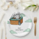 Adorable personalisierte Baby-Dusche-Teller mit einer Abbildung einer niedlichen grauen Maus in einem Heißluftballon-Korb schwebend weg. Personalisieren Sie den Text mit Ihrem eigenen. Illustriert und entworfen von Patricia Alvarez.