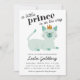 Einladungen für die Babydusche mit ansprechender Darstellung eines minzgrünen Katzenprinzen. Das Kätzchen trägt eine Krone und legt sich mit einem Lächeln auf sein Gesicht. Im Text über der Abbildung steht: "Ein kleiner Prinz ist unterwegs." Die Babydusche-Information ist unter der Katze. Die Texte sind online leicht editierbar. Original Illustration und Design von Namibear Art Studio.