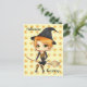 Niedliche Halloween-Chibi-Hexe und ihr schwarzes Kätzchen reiten auf einer Postkarte einen Besen gegen einen Bonbonuntergrund. Anpassbar, sodass Sie Text auf Wunsch ändern können.