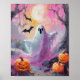 Ein spielerisches, modernes Kunstgemälde mit einem niedlichen Halloween-Thema mit einem zauberhaften Geist, Kürbissen und Fledermäusen. Das Kunstwerk wird mit lebhaften Rosa-, Orange- und Schwarztönen zum Leben erweckt und verleiht den traditionellen Halloween-Bildern eine skurrile Drehung. Die lebhaften Farben und die charmanten Figuren schaffen eine fröhliche und festliche Atmosphäre, verschmelzen sprichwörtliche und süße Elemente für ein einzigartiges, leichtes Halloween-Spiel.