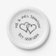Niedliche Papier Hochzeit Teller mit ineinander greifenden Herzen. Personalisieren Sie mit Namen des Paares und Datum der Ehe. Romantisches handgezeichnetes Design mit zwei Lieben-Symbolen. Einfach in Schwarz und Weiß zeichnend.