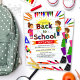 Werben Sie zurück zu den Schulmaterialien und dem Rucksack, der Ihnen dieses niedliche, illustrative Flyer-Design mit einem Schülermädchen und einem Schülermädchen zeigt, das auf einem farbenprächtigen Schriftzeichen mit Typografie gemalt und geschrieben wird, die Schule liefert einen Rahmen, das Flugzeug, die gelbe Sonne und einen Papierhintergrund. Passen Sie die Vorlage Ihren Wünschen an.