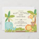 Adorable Baby Dusche Einladung mit dem süßesten Elefanten, Giraffe, Affen, Löwen & Alligator Set auf einem hellgelben Hintergrund mit Palmen.