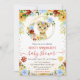 Niedliches Löwendesign mit Rot-, Blau- und Gelbblüten, Konfetti aus Glitzer und blauem Streifen im Hintergrund